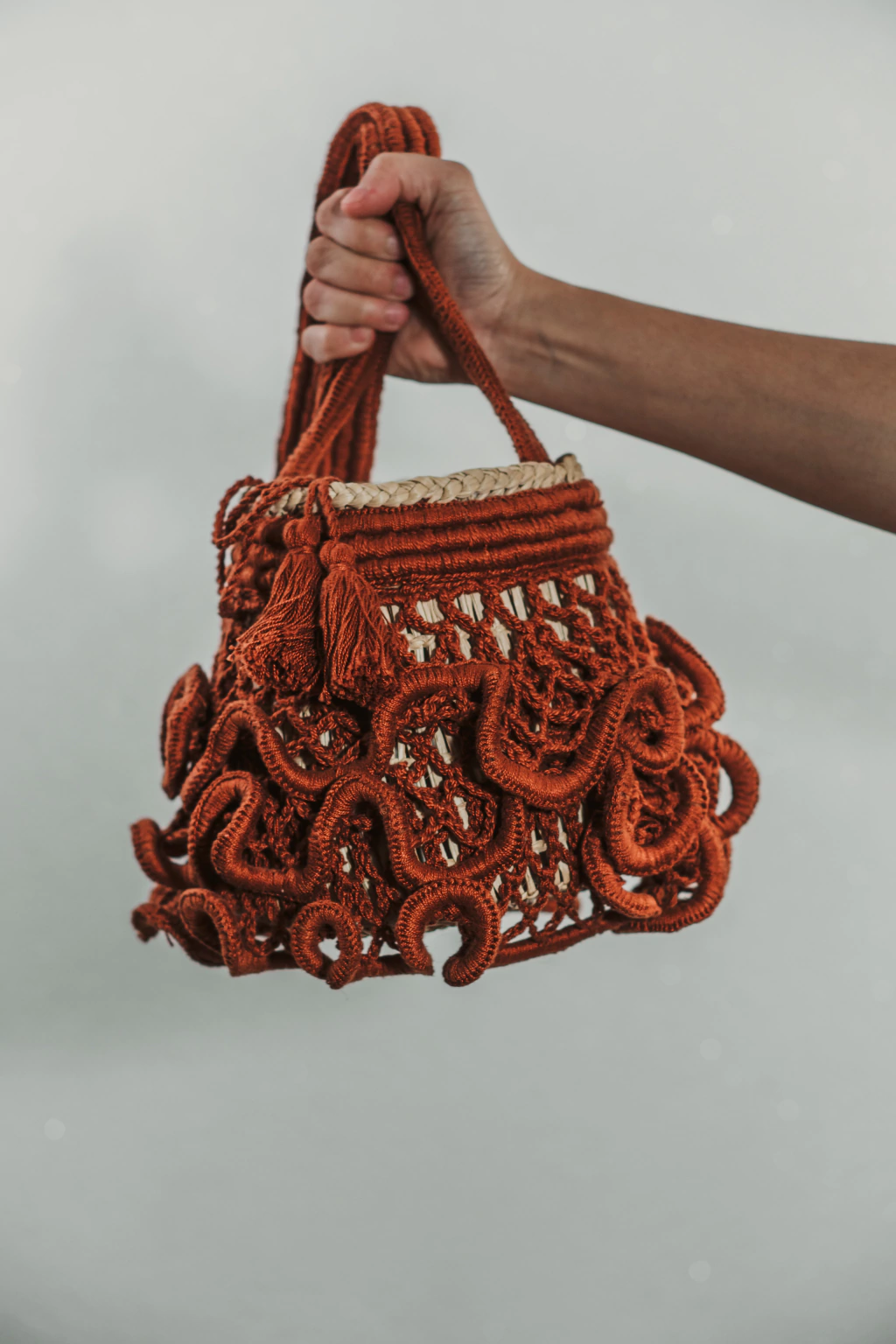 Bolsa em palha com aplicação de crochê na técnica rococó Cearensy.