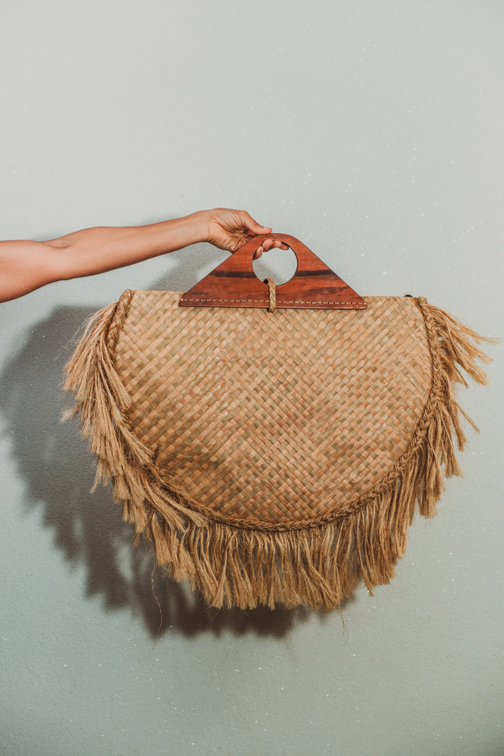 Bolsa de mão feita de palha, sisal de corda e madeira.
