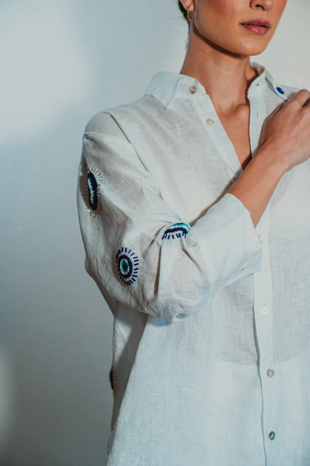 Detalhes: Modelagem ampla, manga 3/4, botões de madrepérola, 100% linho com aplicações em crochet e bordado de canutilho.