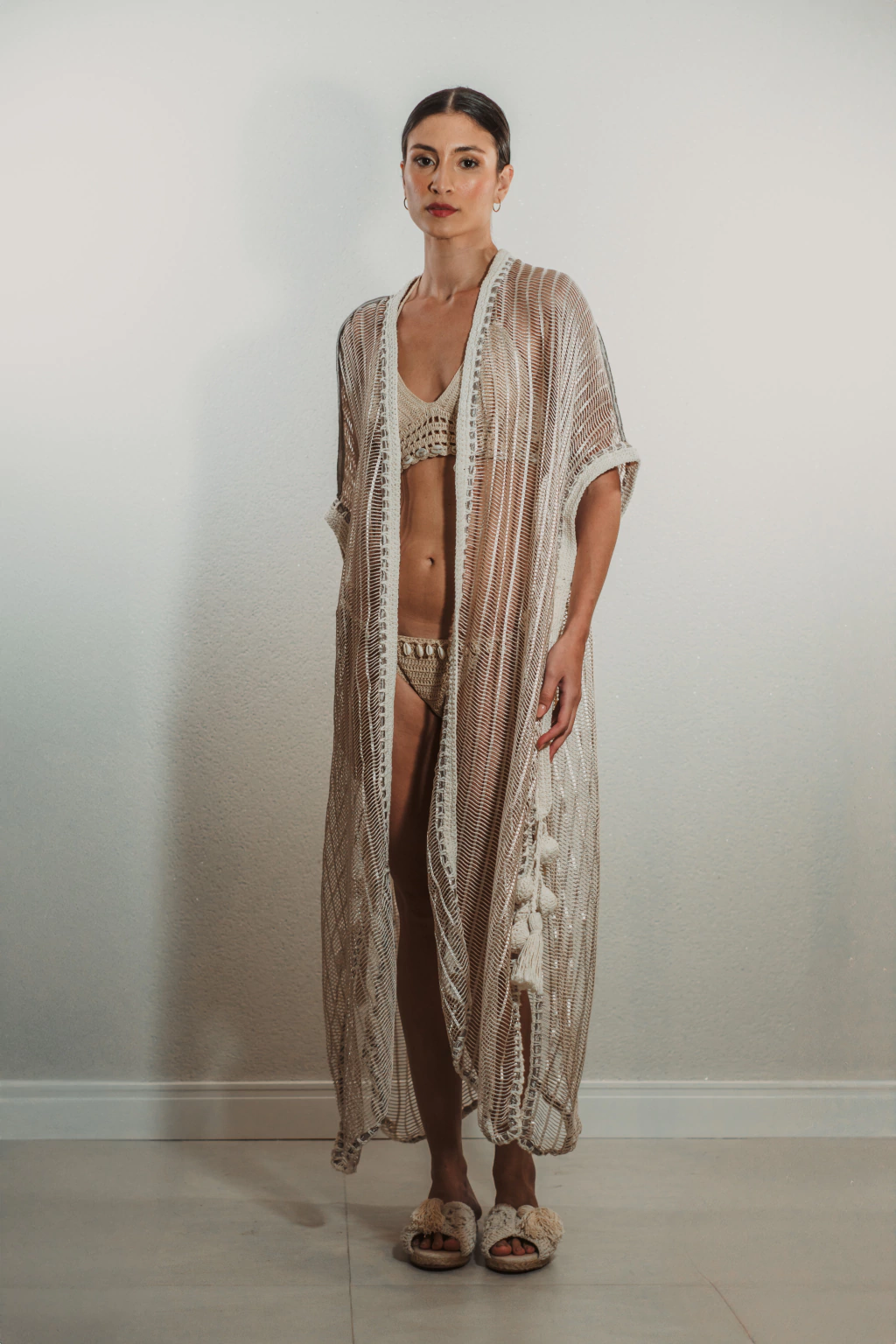 Tela prata com detalhes em crochet cru.