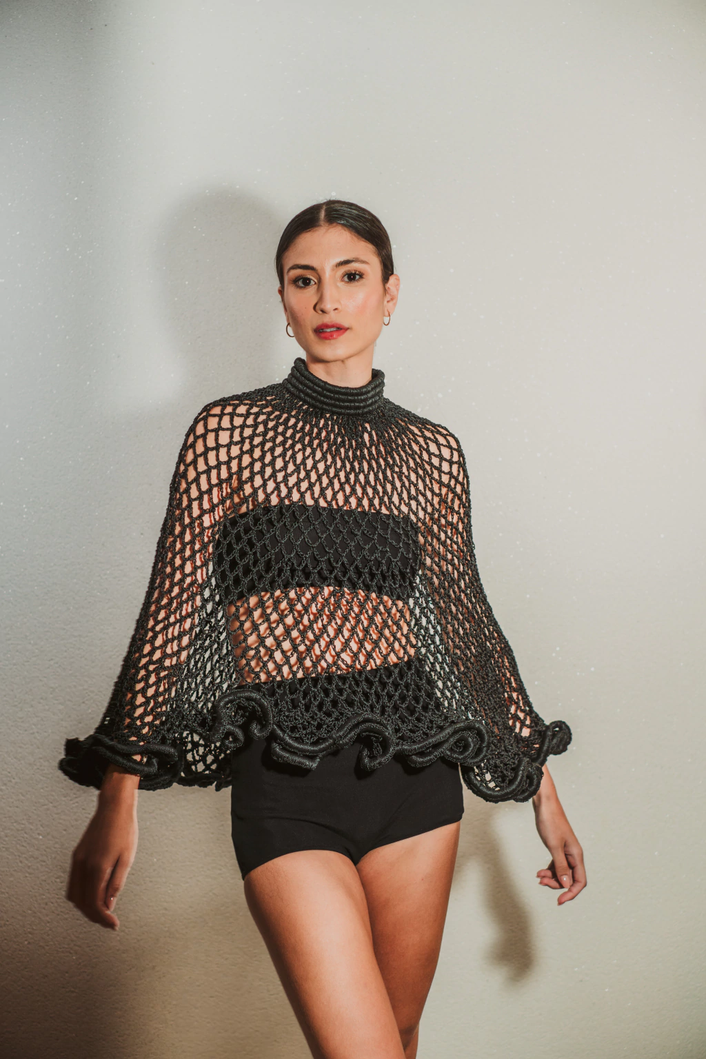 Detalhes: Modelagem ampla, cheia de movimento e confortável com gola alta com fechamento em botões também em crochet.
